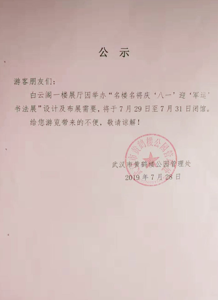 • 武汉市黄鹤楼公园关于 2019 年中秋节及国庆节期间进行门票全网预售(试行)的公告